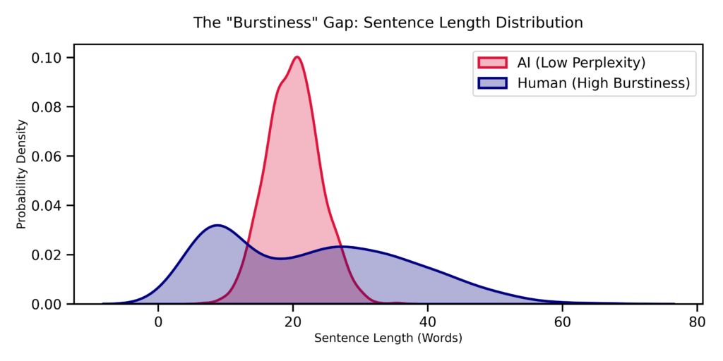 The Burstiness Gap. The red curve (AI) shows a high-kurtosis distribution, meaning the model relentlessly adheres to an “average” sentence length of 15-20 words. The blue curve (Human) is platykurtic and multimodal, illustrating the “bursts” of short (<5 words) and very long (>30 words) sentences that characterize natural thought.