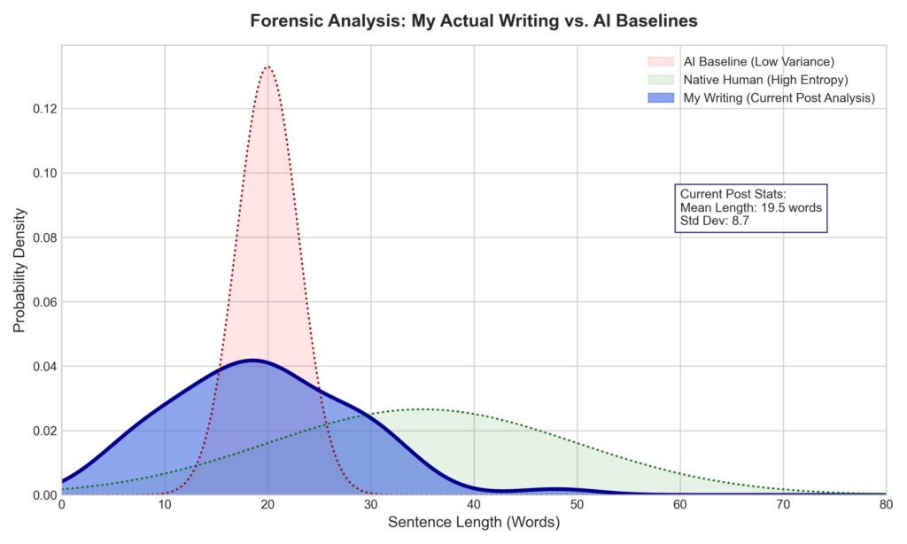 To demonstrate this, I analyzed the sentence length distribution of my current post (this very article). While I wrote this piece myself, I utilized slight AI assistance for editorial polishing. This hybrid context creates a perfect forensic test case. As a non-native English speaker, my writing style (Blue Line) prioritizes grammatical precision and clarity. The analysis reveals a mean sentence length of 19.5 words, which is strikingly close to the AI baseline (Red Line). However, my standard deviation is 8.7, significantly higher than the machine’s tight variance. This “False Positive” zone demonstrates how human intent—even when polished by algorithms—creates a statistical signature that commercial detectors frequently mistake for fully synthetic content.