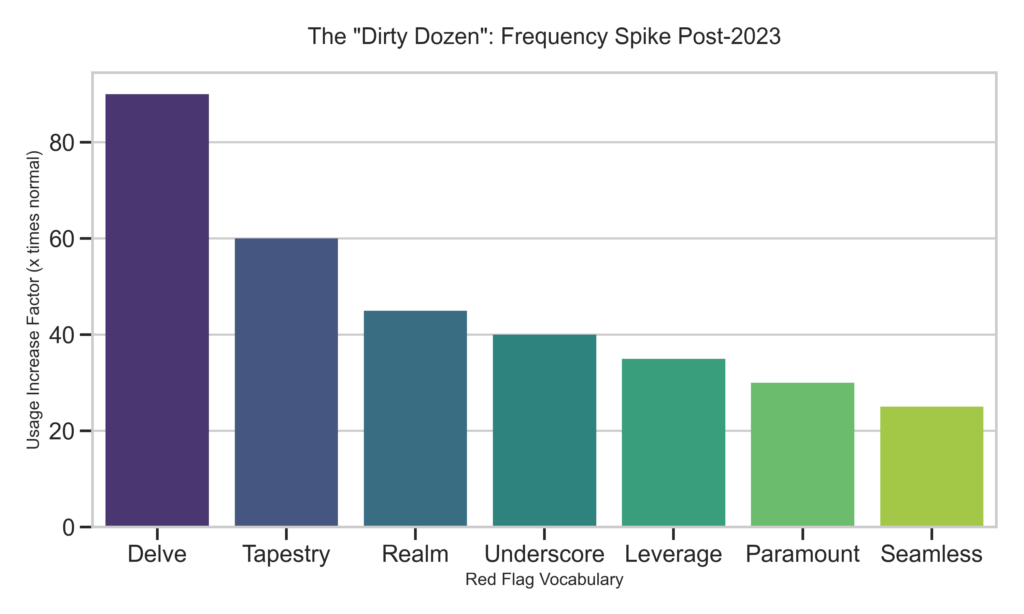 The “Dirty Dozen” Frequency Spike. This chart tracks the “Usage Increase Factor” of specific terms in 2024 compared to pre-2023 baselines. The word “Delve” has not merely become common; its usage has surged by a factor of nearly 90x, a statistical anomaly impossible to attribute to natural language evolution.