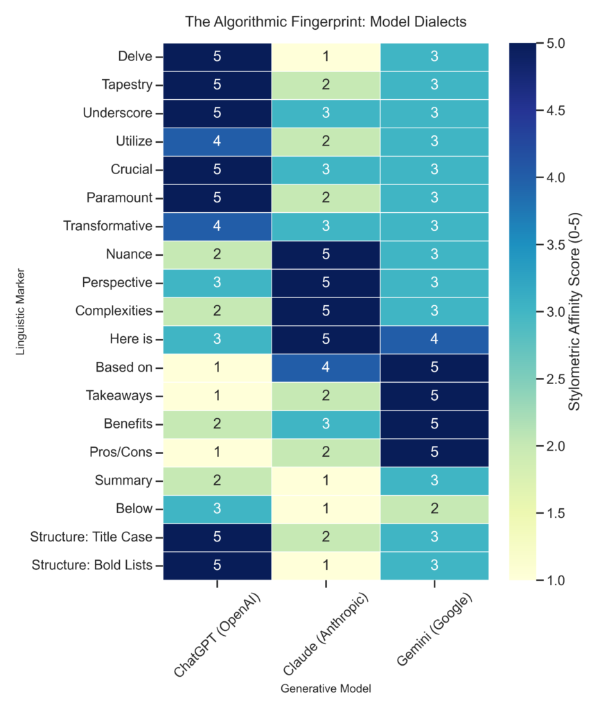 This optimization process creates distinct dialects for each model family. OpenAI’s ChatGPT frequently employs words that sound like an academic consultant, such as “delve,” “underscore,” and “paramount,” while Anthropic’s Claude often adopts a verbose and deferential tone using words like “nuance” and “perspective.” Google’s Gemini distinctively leans towards search-engine optimized structures filled with “key takeaways” and pros-and-cons lists [3].