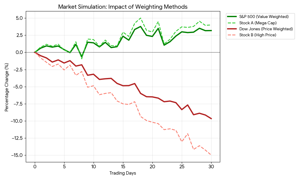 To show how this plays out, I put together a simple simulation of a 30-day trading month with two companies: Stock A, a mega-cap giant (like Apple) with a lower share price, and Stock B, a high-priced company (like Goldman Sachs) with a smaller market cap. In this setup, the big, fast-growing Stock A climbed 4% and added a lot of value, while the high-priced Stock B lost significant ground. You can see the results of this simulation in the figure below, which compares the S&P 500 (value-weighted) and a Dow Jones-style (price-weighted) index.