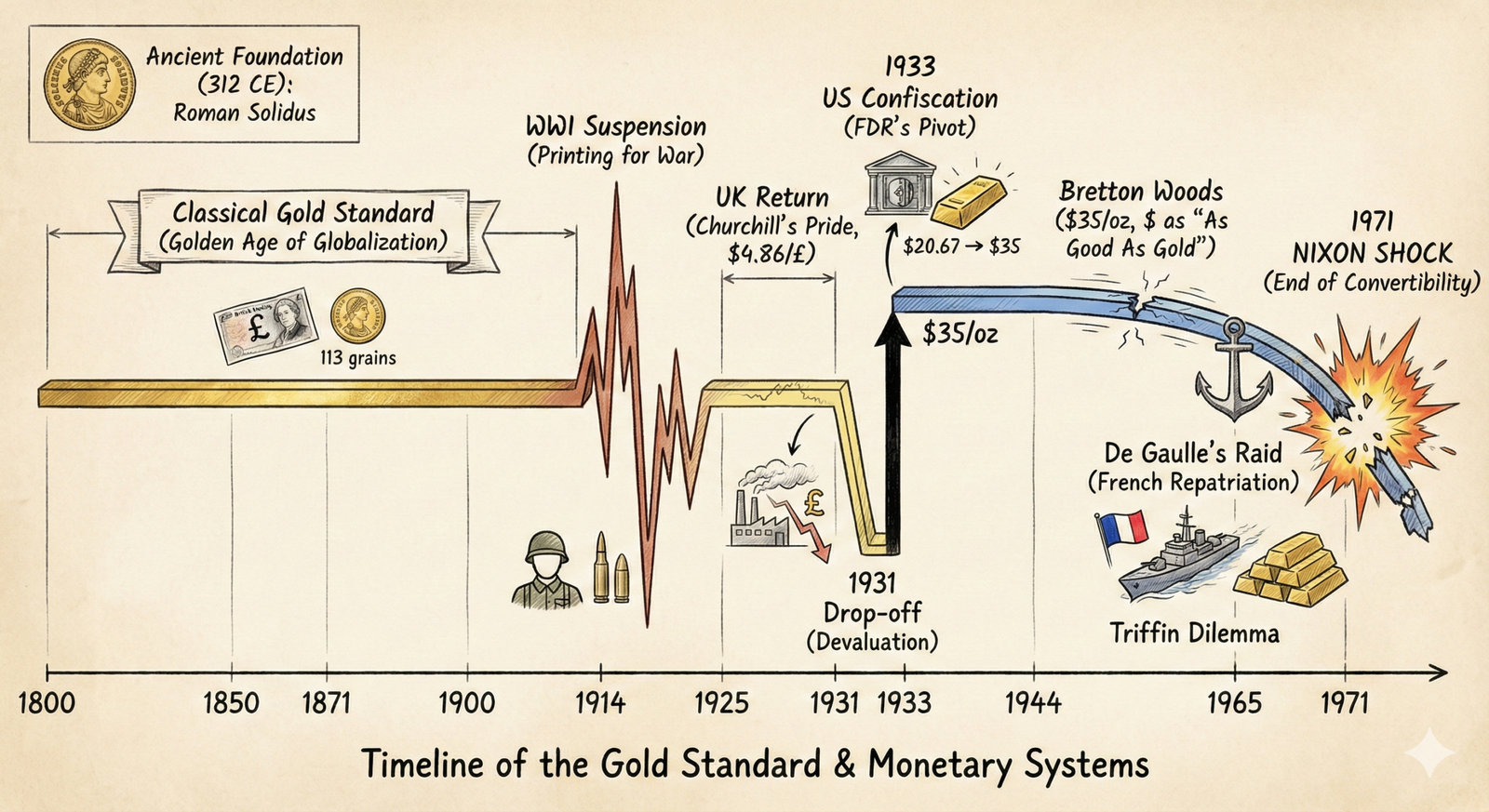 Moving into the 1800s, the world settled into what’s often called the Classical Gold Standard, which was really the high point of global trade and cooperation. Back then, money was just a name for a certain amount of gold—so, for example, a British Pound was simply 113 grains of pure gold. If one country bought more than it sold, gold would flow out to balance things out, so the system kind of kept itself in check. But there was a big problem hiding in plain sight: when countries suddenly needed to spend huge amounts of money, like during World War I, the gold standard just couldn’t keep up. The UK and others had to stop letting people trade their money for gold, because they needed to print more money to pay for the war, and gold was getting in the way.