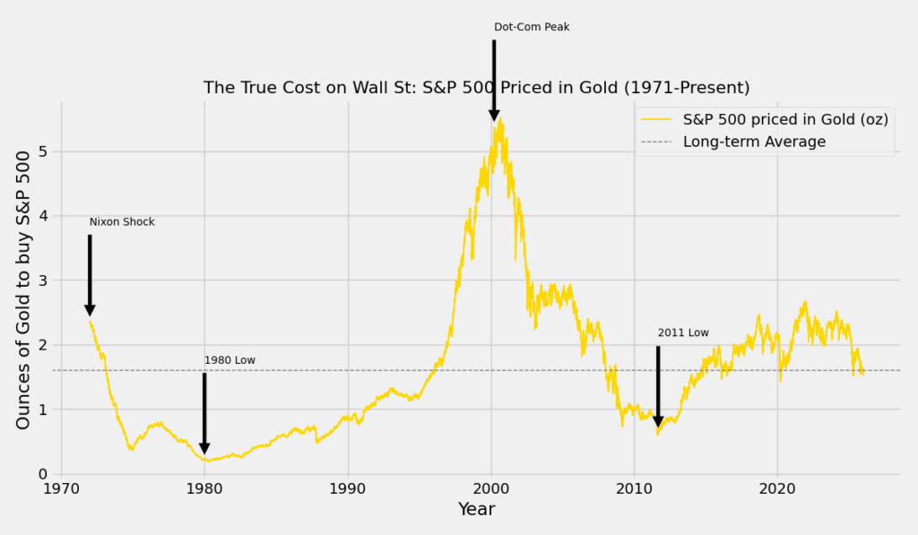 So if we fast forward to today, the S&P 500 is trading at about 1.58 ounces of gold, which is almost exactly the same as the average since 1971, sitting at 1.60 ounces. Even with all the excitement around AI and the fact that stock prices keep hitting new highs in dollar terms, what we really see is that stocks are just about fairly priced when you look at them in real terms. It’s not that we’re in some kind of bubble; it’s more that the dollars we use to measure everything have lost a lot of their punch.