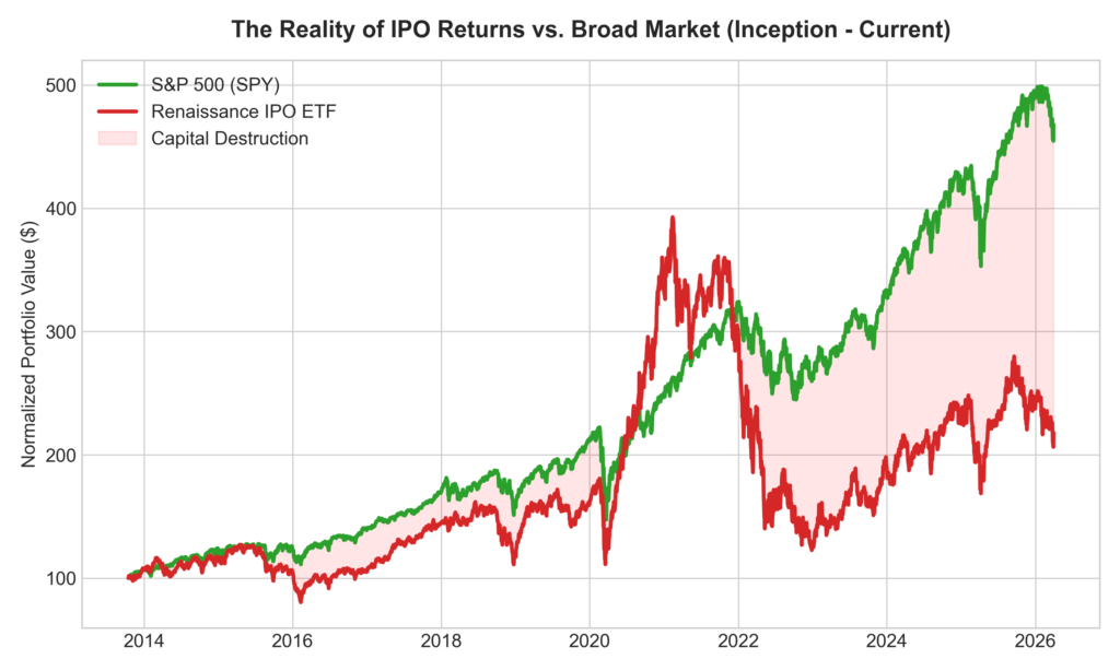 You don’t have to take my word for it, though, because we can actually see this pattern happening in real time: if you look at the Renaissance IPO ETF, which is basically a fund that just buys new public companies as soon as they’re available, and compare it to the S&P 500, you’ll notice that over the long haul—starting from when the IPO fund launched in 2013 right up to now—the IPO-focused strategy has lagged behind, no matter what market cycle we’re in.